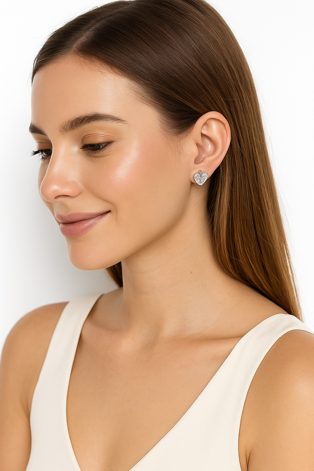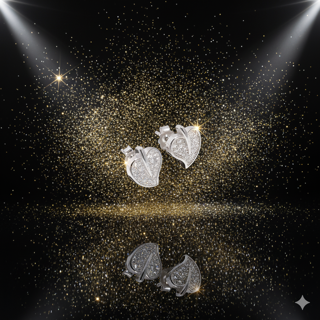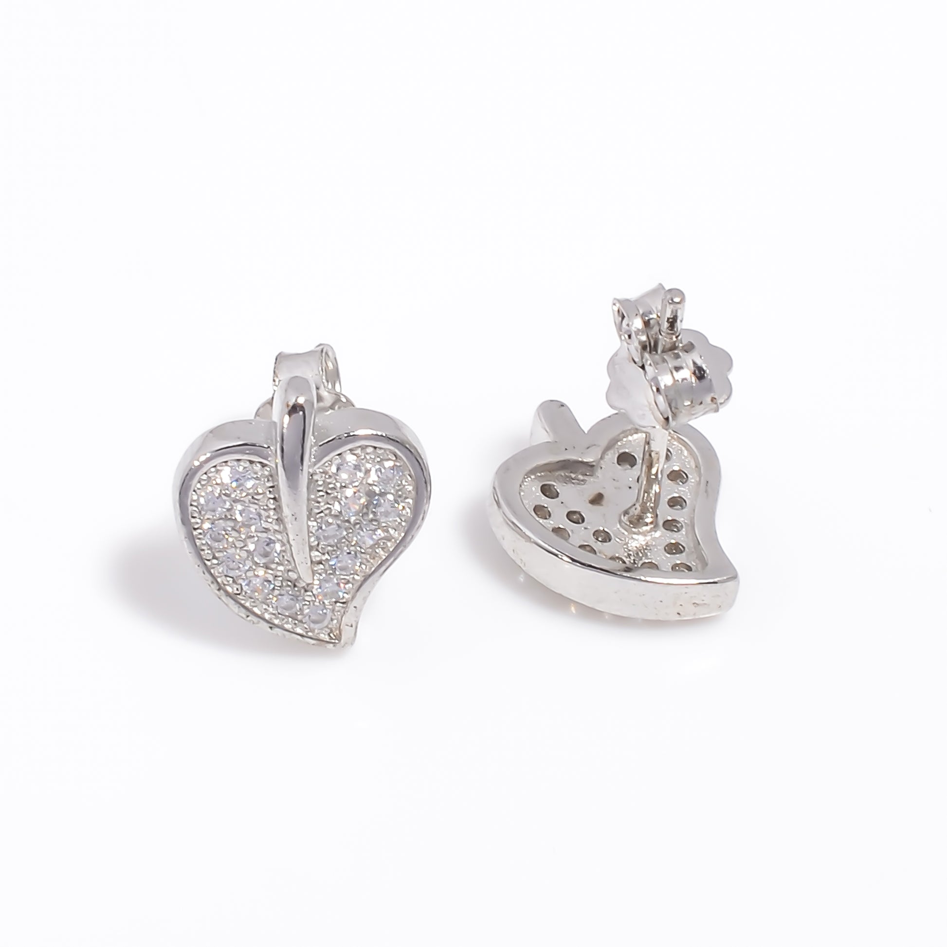 Add a touch of timeless elegance to your look with these silver heart stud earrings. Designed with a unique heart silhouette accented by a sleek central line, each earring is encrusted with shimmering stones for a radiant finish. Perfect for everyday wear or special occasions, these lightweight studs bring just the right amount of sparkle to complement any outfit. Crafted with precision and care, they make a thoughtful gift for someone special or a chic addition to your own jewelry collection.
